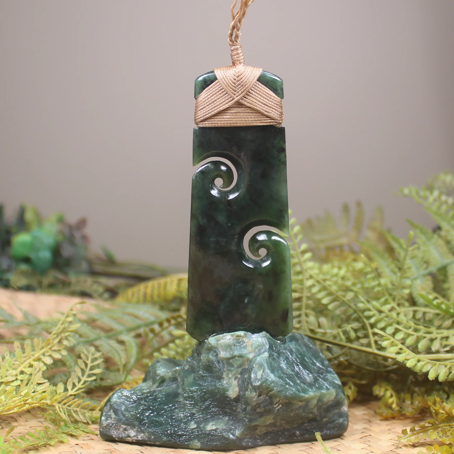 Stunning Rimu Pounamu carved into a lovely Toki with Koru Sculpture with a Pounamu base. Made by Allan Moreton.